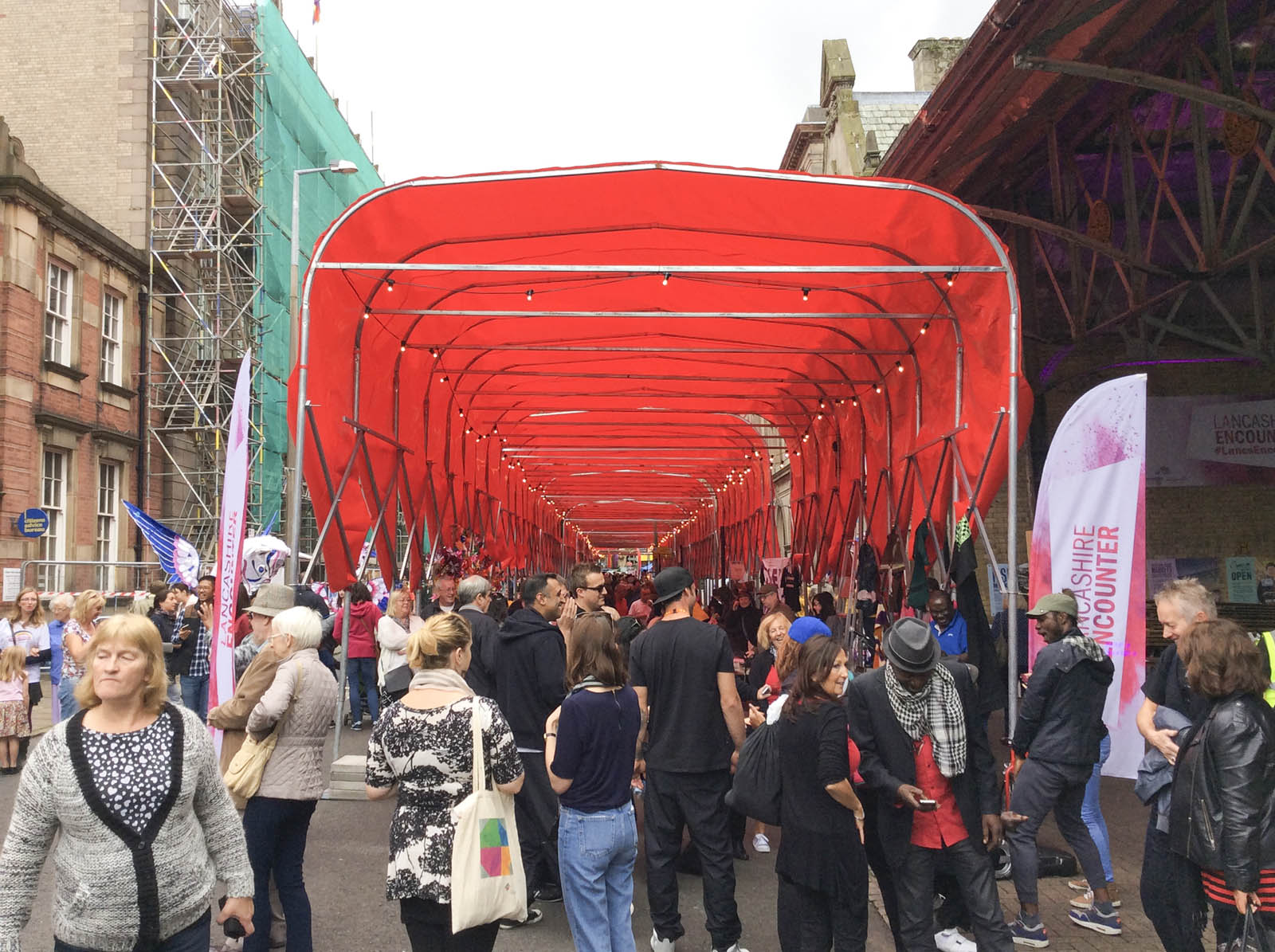 Imagine a massive bright red, two-story canopy heading toward you on multiple bicycles. Sound like something out of the movies? Well, it’s no fantasy. Called the People’s Canopy, the structure was commissioned by the city of Preston in the United Kingdom, working with In Certain Places, an art program for urban intervention and events, as a way to revitalize the city’s historic but neglected center.
